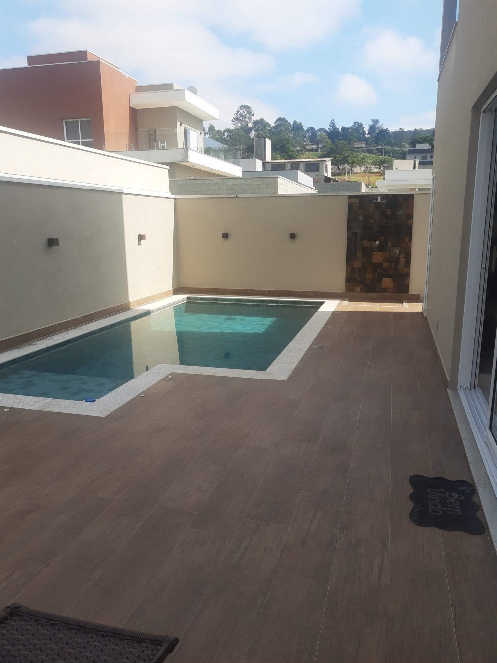 Piscina no quintal, jardim na frente da casa.